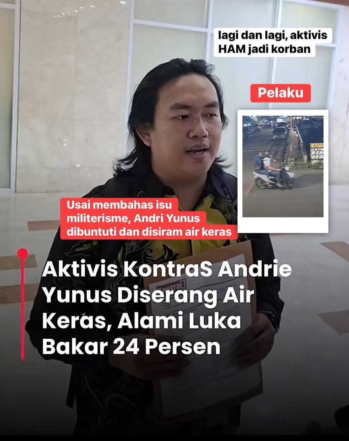 Koordinator Badan Pekerja KontraS, Dimas Bagus Arya, dalam pernyataan pers yang diunggah di akun resmi KontraS, Jumat (13/3/2026 menyebutkan, Wakil Koordinator KontraS, Andrie Yunus, telah mengalami serangan penyiraman air keras oleh Orang Tidak Dikenal (OTK) yang mengakibatkan terjadinya luka serius di sekujur tubuh terutama pada area tangan kanan dan kiri, muka, dada, serta bagian mata.