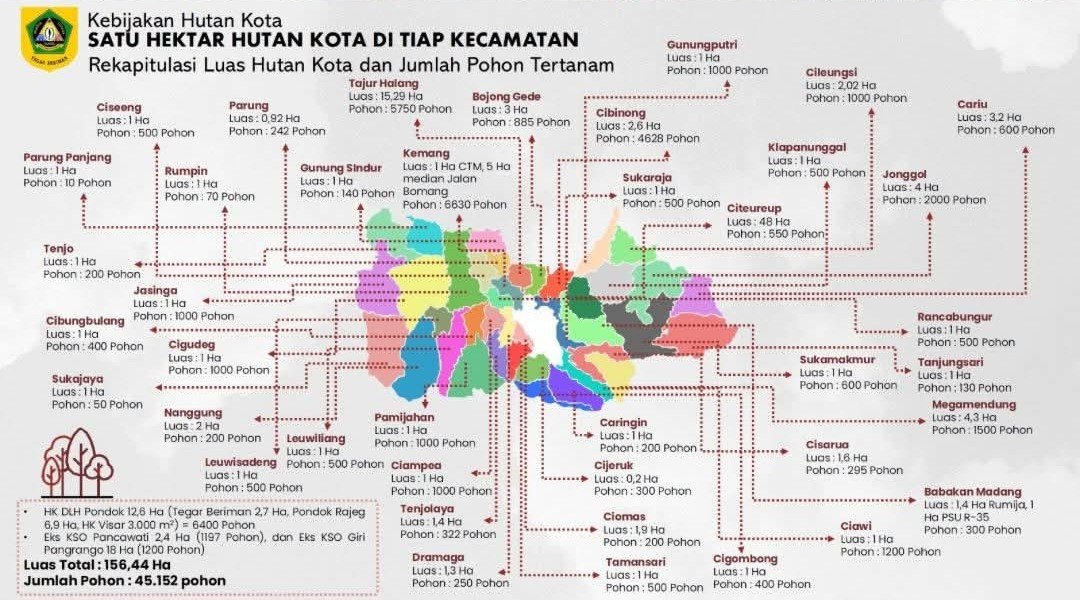 Hingga saat ini, capaian program tersebut telah menghasilkan pembangunan hutan kota seluas 156,44 hektar yang tersebar di seluruh Kabupaten Bogor, dengan jumlah pohon yang tertanam mencapai 45.152 pohon.